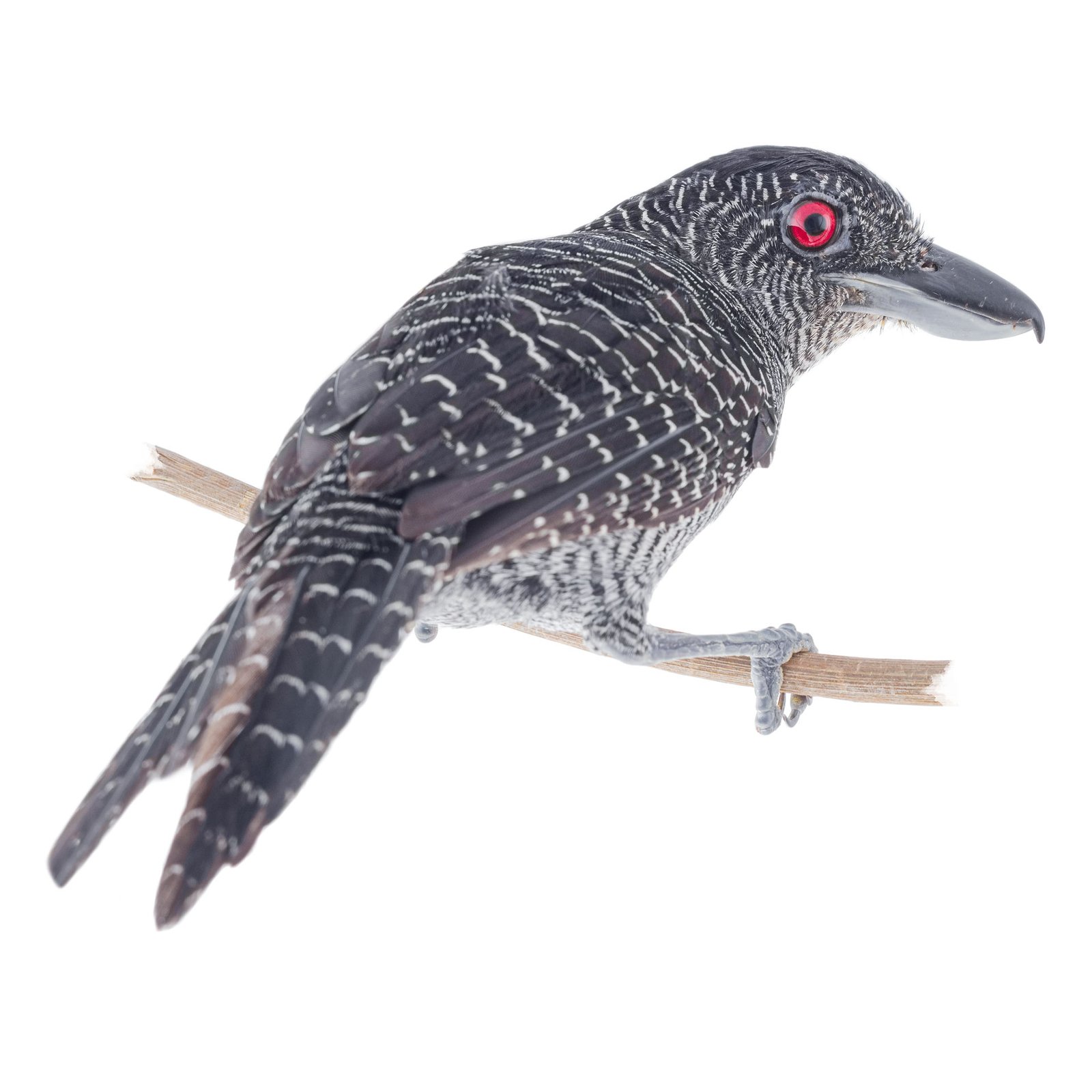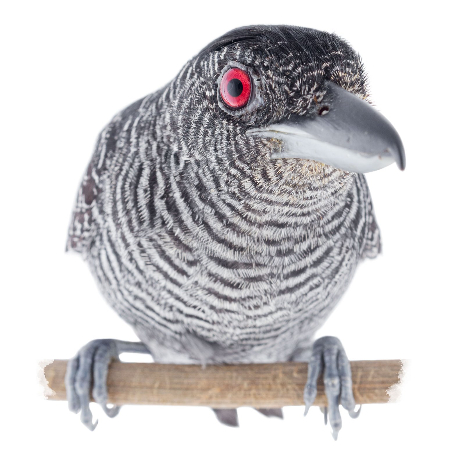 Macho barrado de negro y blanco con corona negra, hembra barrada de negro, blanco y castaño con corona rojiza