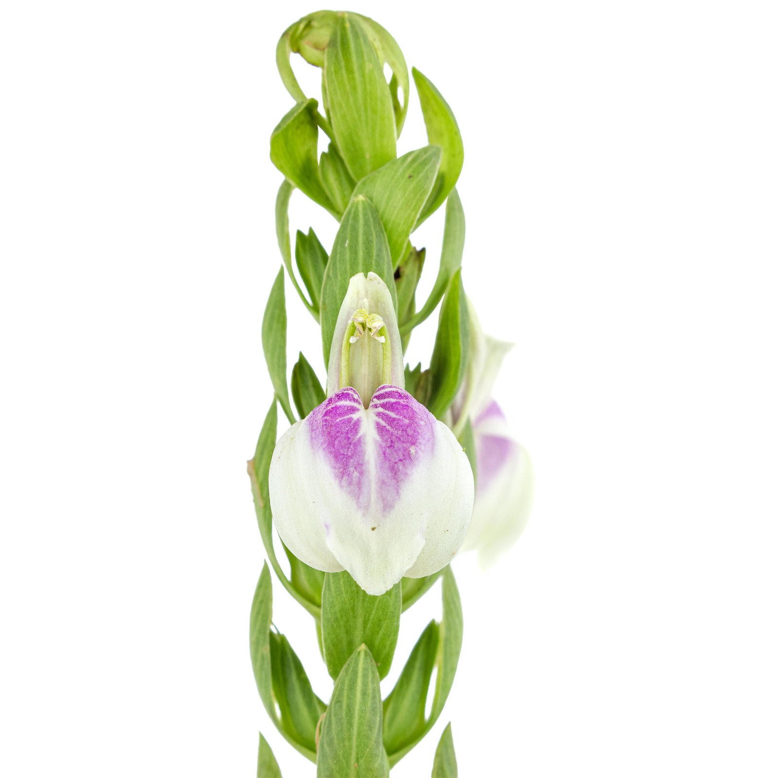 Arbusto de 3 m de altura. Inflorescencia hermafrodita en espiga terminal verde, flores zigomorfas blancas con morado en la base