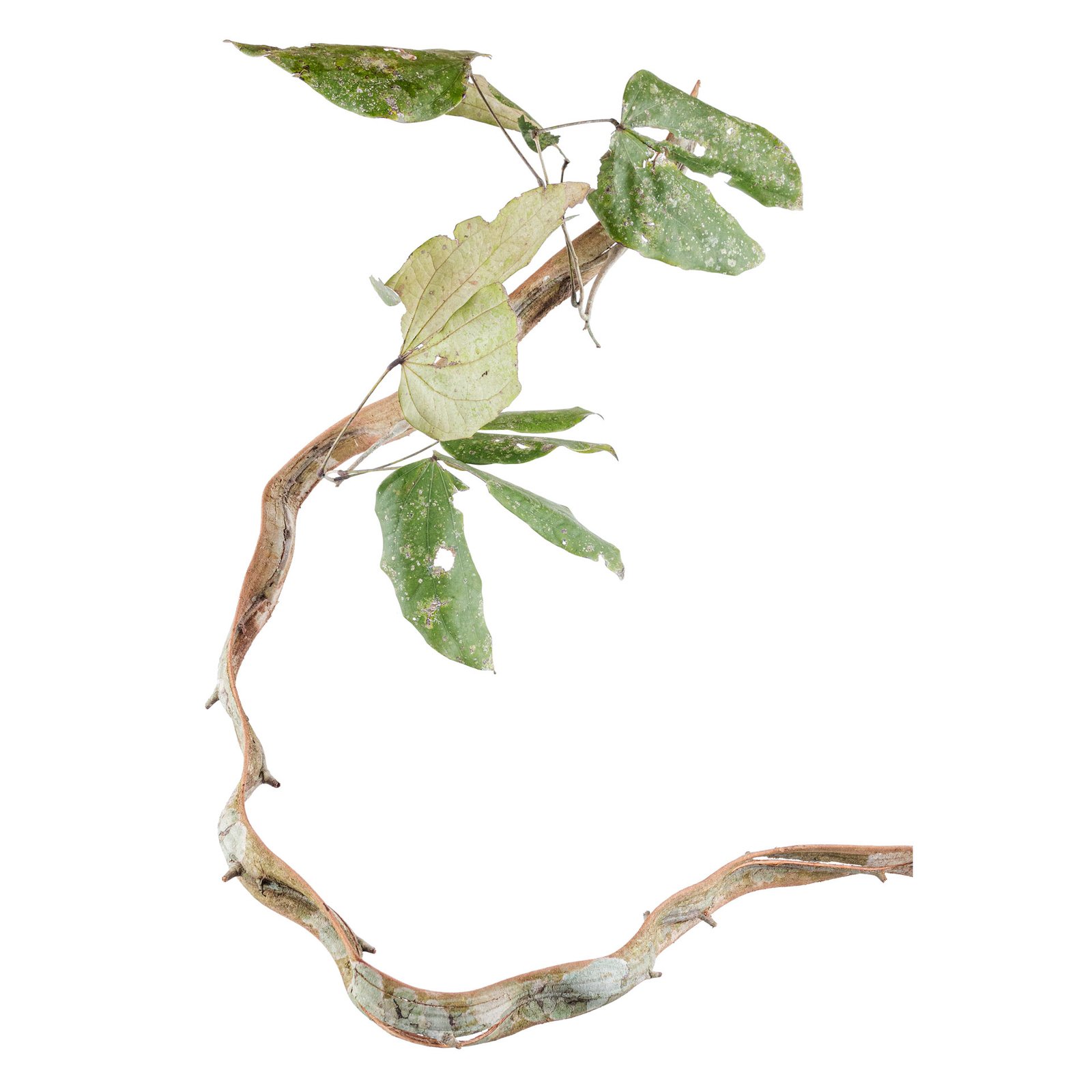 Bejuco leñoso con tallo aplanado y ondulado que puede engrosarse hasta 20 cm. Hojas simples, alternas, bilobuladas, ápice acuminado, envés con escamas plateadas