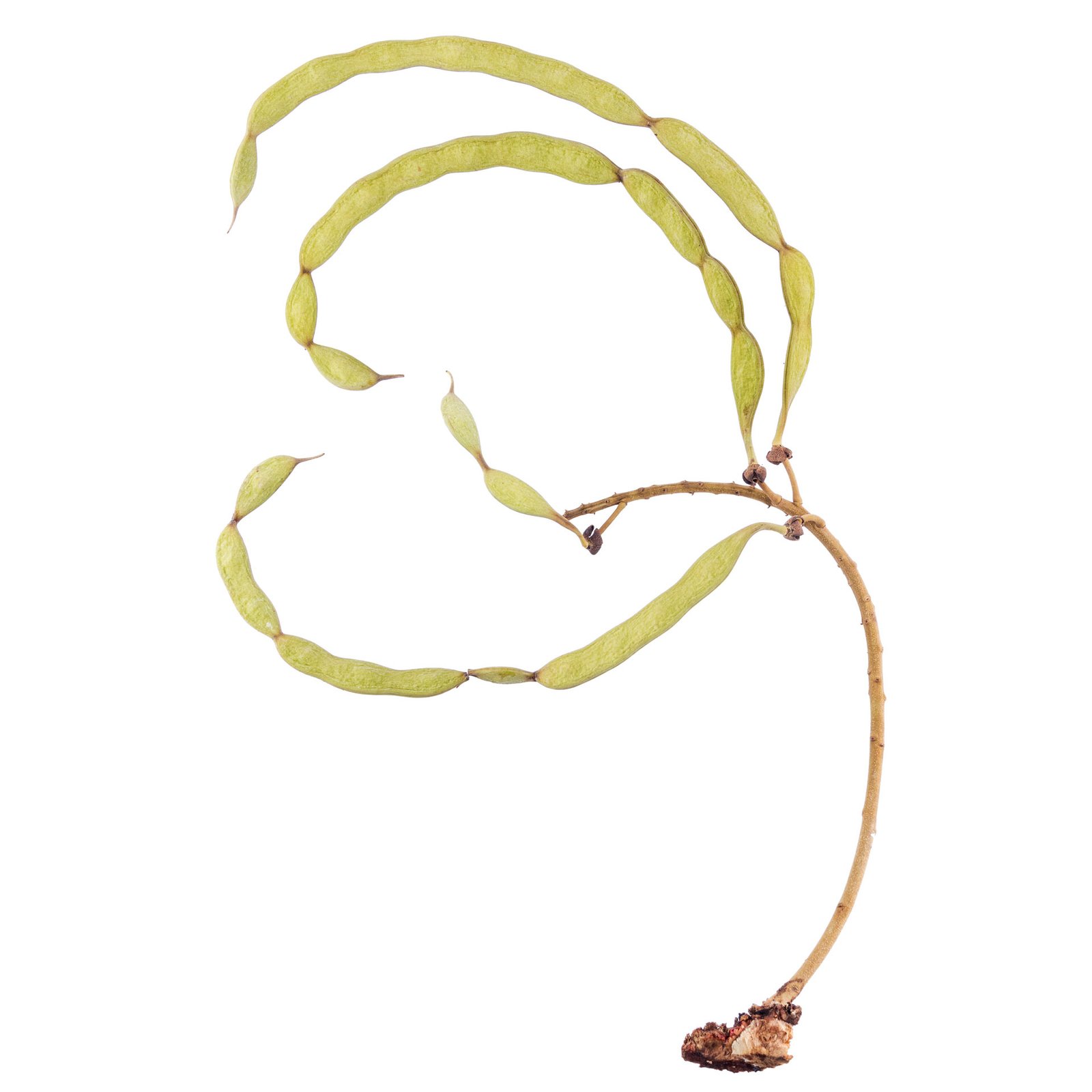 Árbol de 26 m de altura. Exudado de color rojo y frutos en vaina, caulinares en la base del eje principal