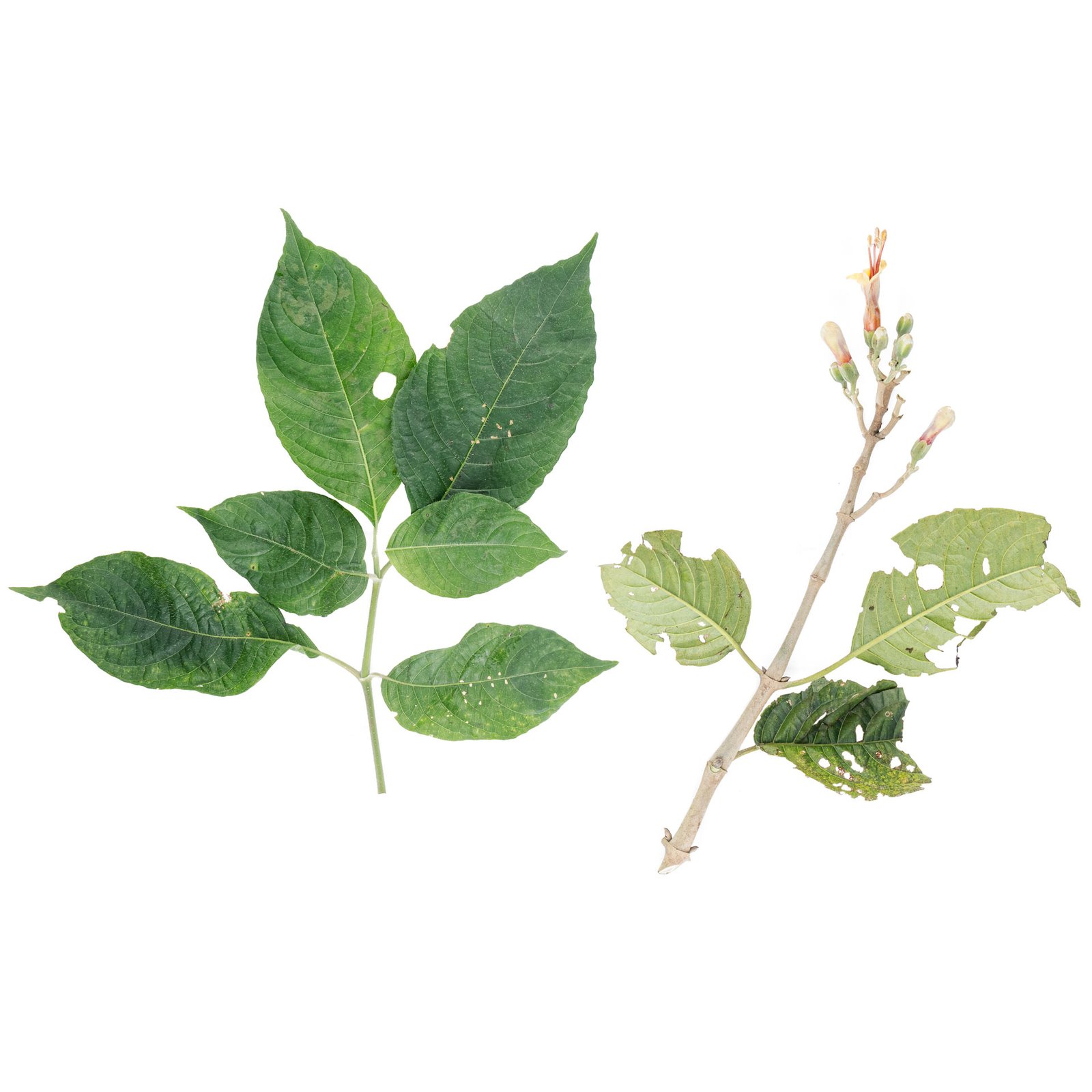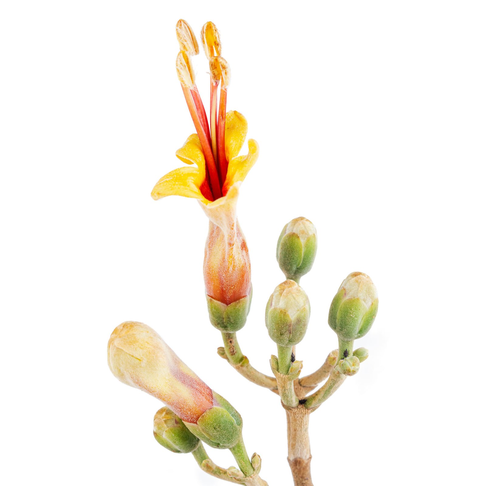Árbol de hasta 10 m de altura. Hojas simples, opuestas, con tricomas simples, margen ondulado, ápice acuminado. Inflorescencias terminales cimosas. Flores dispuestas en pares, cáliz verde claro, corola gamopétala anaranjada, más oscura en el interior, estambres exertos, anteras con dehiscencia longitudinal, pubescentes